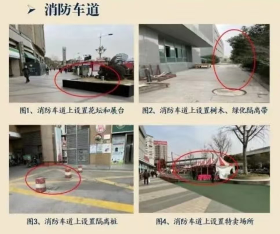 消防车道上设置景观花坛、时建(构)筑物树木、架空管线等障碍物,固定隔离桩、停车泊位或临时展台、特卖场所等,影响消防车辆通行。