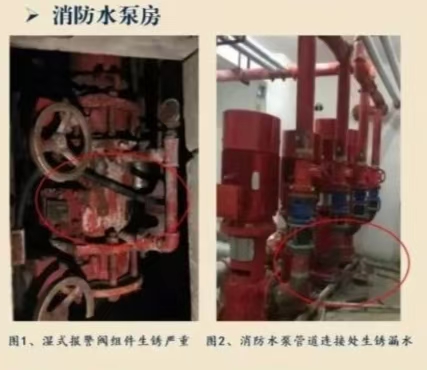 消防水泵房内设施、设备缺乏定期维护保养,消防管道锈蚀严重,导致阀门不能正常转动,管道漏水。