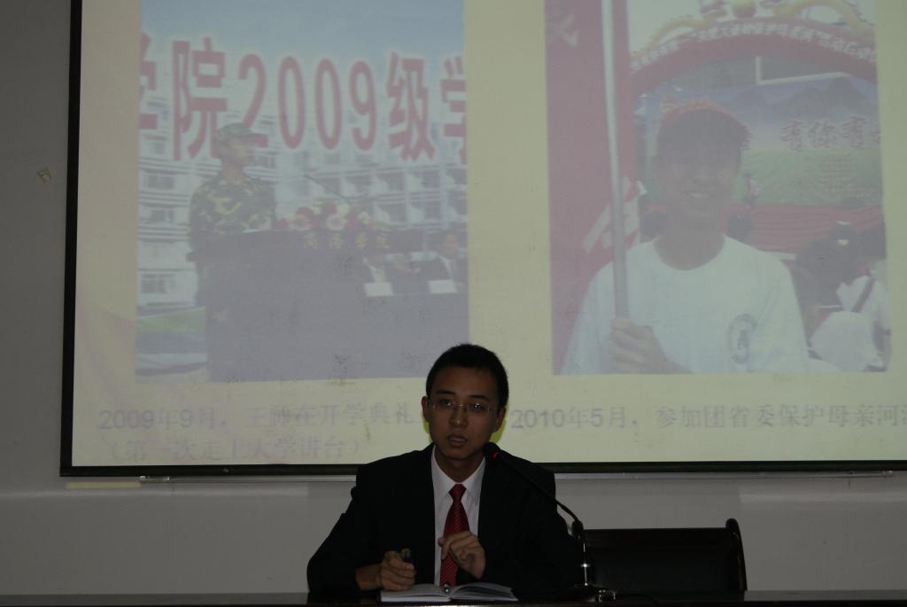 王帅,在一号楼报告厅一为我系汉语言文学和文秘教育专业新生作个人成长交流报告。本次交流会由中文系员工分会主席李军主持。