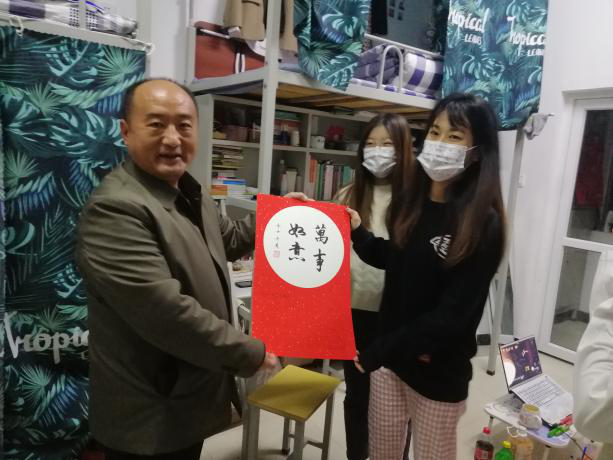 疫情无情,人文有情。院领导及学工人员向同学们致以新年祝福,希望同学们妥善安排好学习和生活,有困难及时反映。党总支副书记杜明生用手工挂历的形式为同学们送上了新年祝福同时耐心解答了同学们的问题,详细了解了同学们封校期间的学习和生活情况,叮嘱大家在疫情期间要做好防护。