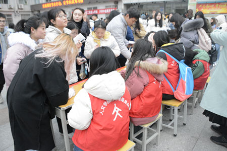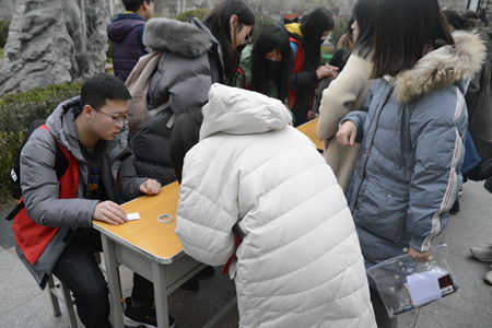 考场内公司考生认真作答,监考老师与安保人员积极巡逻,同时为考生们提供收音机和电池等考试必需品;考场外志愿者们热心提供服务,为考生看管随身物品。