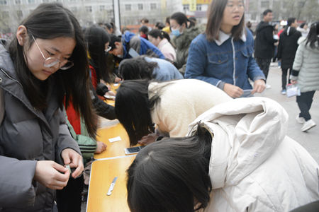集团践行诚信考试,考场外悬挂诚信考试的宣传横幅,考场入口设有金属检测仪,安检人员对考生进行严格安检和身份检查,考生积极配合安检相应工作。