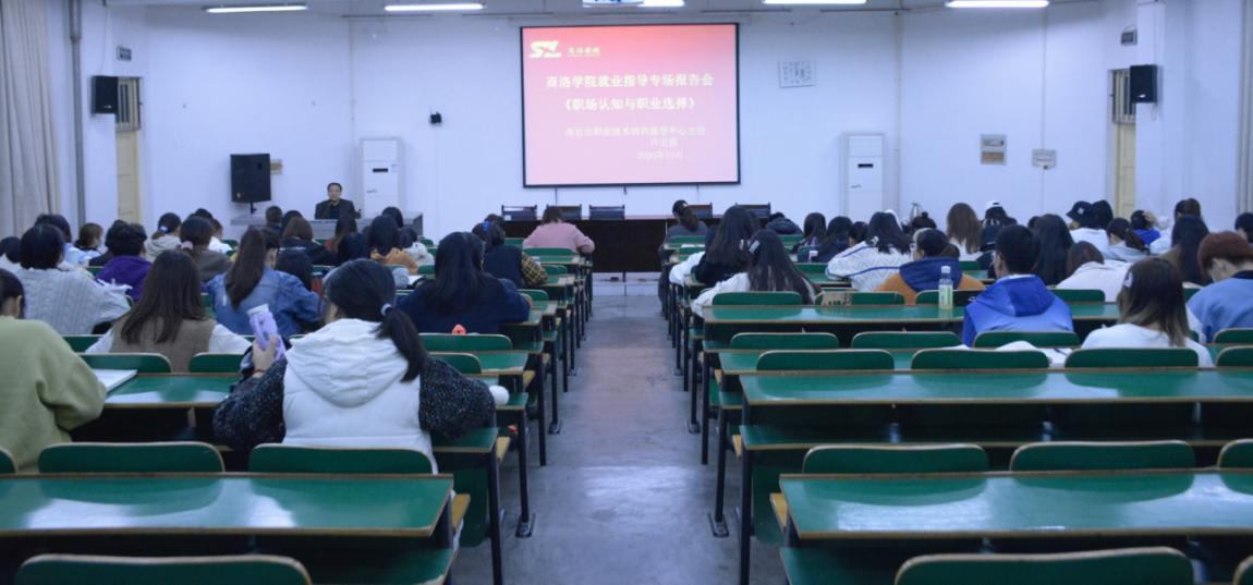 讲座由南京市职业技术培训中心主任许宏报主讲,就业指导中心主任于晓明主持。许老师结合同学们的专业实际,从就业意义与职业定义、职业兴趣与职业选择、职业能力构成、综合能力培养与幸福人生等同学们在未来就业过程中会遇到的一系列问题做了细致准确的讲解,为同学们解答了关于就业的诸多疑惑。