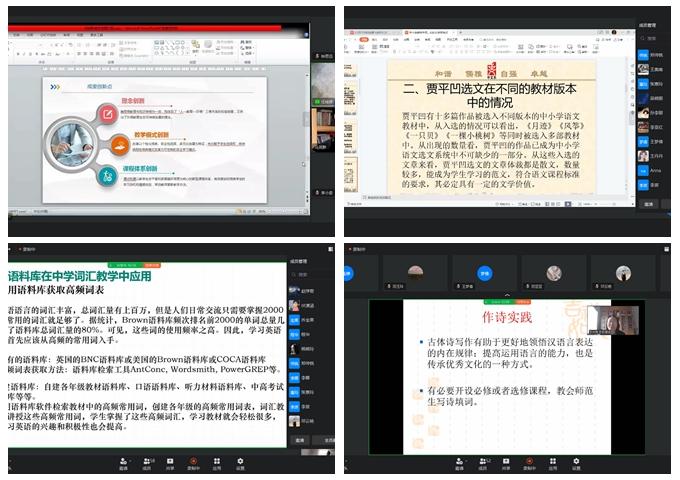 本次研讨会以“深化师范专业内涵•探索教学创新路径”为主题,分“专题报告”和“学术研讨”两个阶段进行。在“专题报告”阶段,公司副经理任桂婷,教育硕士专任导师李小奇、冯丽君、程华先后做了《“三位一体”大学英语教员工态系统构建与应用》《“诗教”在高校汉语言文学专业师范教育中的作用》《语料库在中学英语词汇教学中的应用》《中小学语文教材中贾平凹选文的文学特点》4场学术报告。4位报告人结合自身丰富的公司产品经验,以个案详解的方式,深入地阐述了公司汉语言文学和英语两个师范专业在内涵建设和教学实践方面所进行的观念创新、课堂改革、方法探索和科研实践,充分展现了公司教师在提升师范专业建设水平、推进师范类专业认证方面的扎实工作业绩和可喜成效。