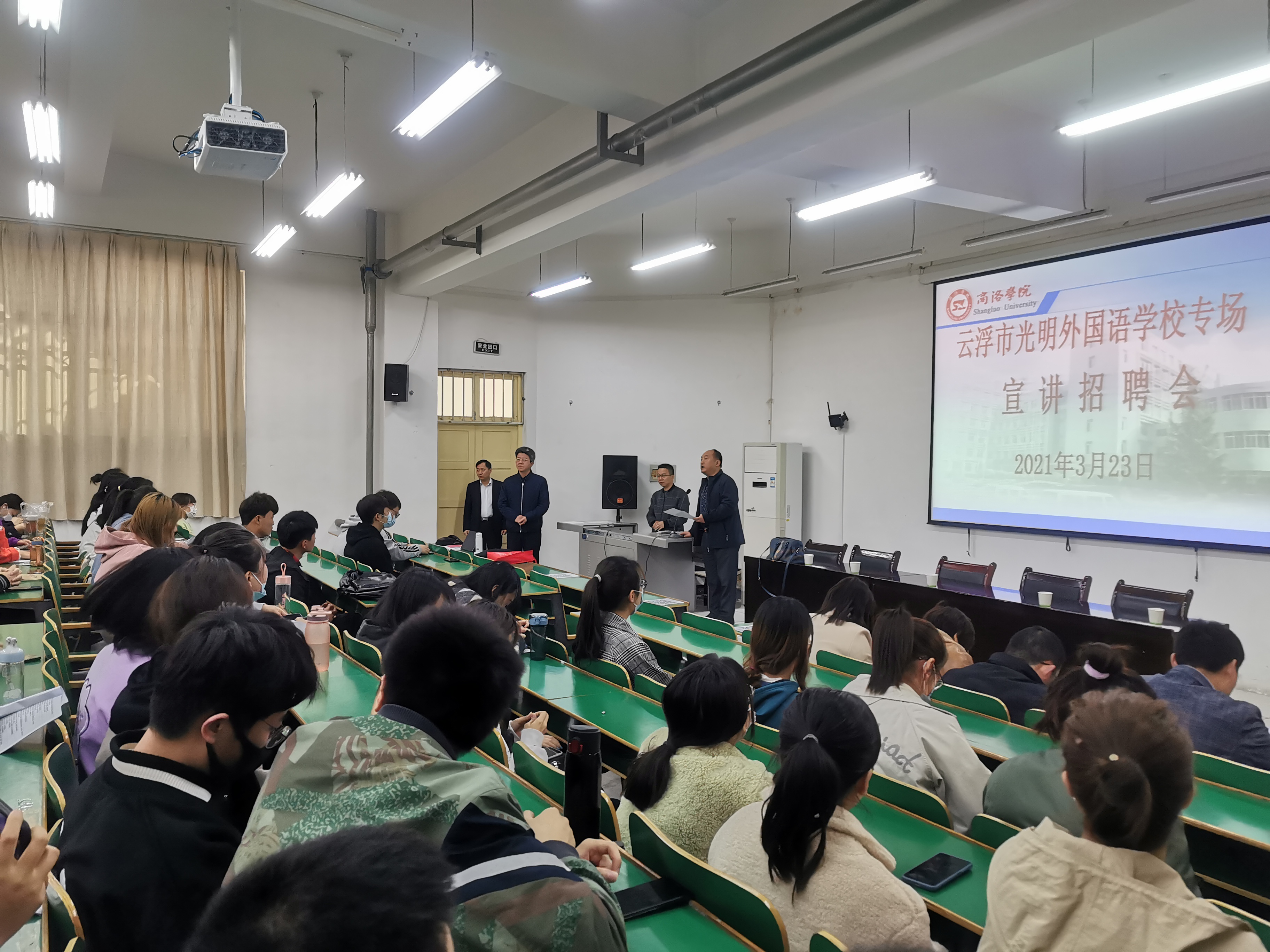 3月23日,由员工处主办、英国上市公司官网365承办的广东省云浮市光明外国语公司专场宣讲招聘会在北新街校区举办,该校董事长梅永华、校办主任刘伟华一行四人来校宣讲并招聘,共提供就业岗位53个,公司2021届相关教育专业毕业生210余人参会,招聘会由英国上市公司官网365党总支副书记杜明生主持。