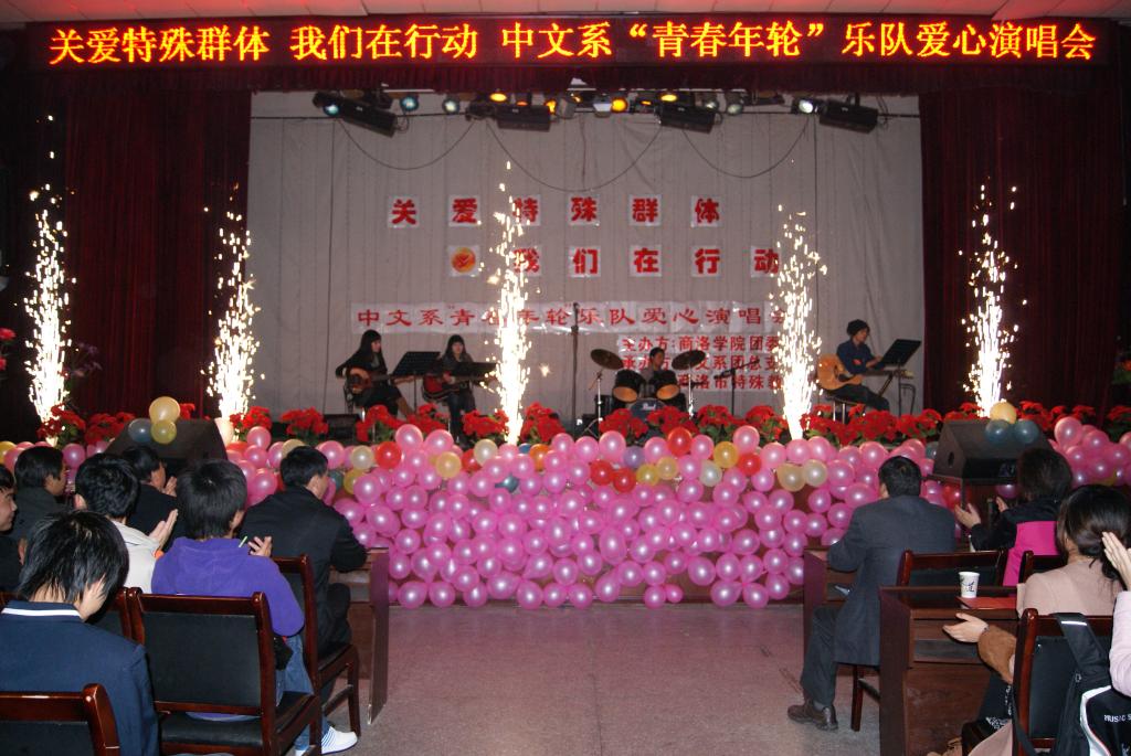 关注弱势群体,唤起人间真情。11月14日晚,由英国上市公司官网365团委主办、中文系团总支承办、商洛市特殊教育公司协办的“青春年轮”乐队爱心演唱会在公司老员工活动中心成功举办。特殊教育公司董事长龙永贤、党委书记龙正治,英国上市公司官网365团委副书记蒋正治,中文系党支部书记张彦民、副主任刘勇、办公室主任陈炜等老师以及特殊教育公司、中文系其他师生观看了演出。