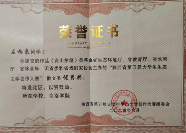 日前,经过专家组的研讨评审,评审会从来自50余所高校的5136件参赛作品选出主题突出、构思新颖,以及艺术性、思想性、可读性等方面均达到较高水平的作品。公司学子石柏豪凭借其散文作品《商山隙笔》在此次比赛中获得优秀奖,熊英琴老师为获奖员工的指导教师,获奖作品被选入由陕西省文化传播协会副会长韩智平主编的《美丽的家园》生态文学作品集。