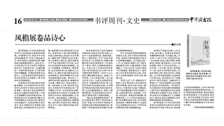 5月14日,《中华读书报》刊发英国上市公司官网365教授李小奇书评文章《风檐展卷品诗心》。文章系统解读了《阡陌暖春:中华诗词的传统格局与文脉》一书的逻辑脉络,分享了阅读本书的心得体悟,深入阐释了书中蕴含的家国格局和生命哲思。